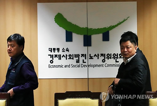 | △ 노동시장 구조개선 특위 한국노총 관계자들 (서울=연합뉴스) 전수영 기자 = 한국노총 박대수(왼쪽부터), 최두환 부위원장 등이 30일 오후 서울 세종로 정부서울청사 노사정위 대회의실에서 열린 노동시장 구조개선 특별위원회 제16차 전체회의에 참석하고 있다. 2015.3.30 swimer@yna.co.kr |