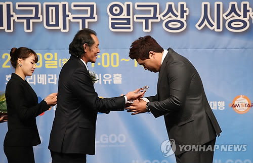 | △ 전설의 만남. 류현진과 박철순 박철순(가운데) 코치가 2013년 12월 9일 서울 청담동 리베라 호텔에서 열린 일구회 시상식에서 류현진에게 특별공로상을 시상하고 있다. <<연합뉴스 DB>> |