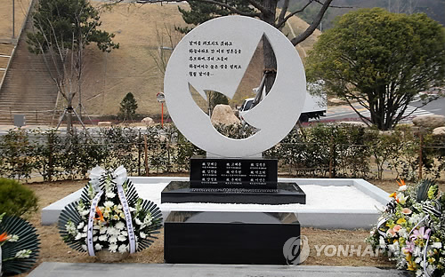 추모공원에는 하얀 색 천으로 가려진 추모비와 조화들이 놓여 있었다.