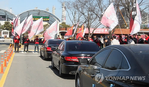 | △ 노조 벽에 막힌 한화 현장실사단 (서산=연합뉴스) 한종구 기자 = 24일 오전 삼성토탈 대산공장 현장 실사에 나선 한화그룹 관계자의 차량을 삼성토탈 노조원들이 막고 있다.2015.3.24 jkhan@yna.co.kr |