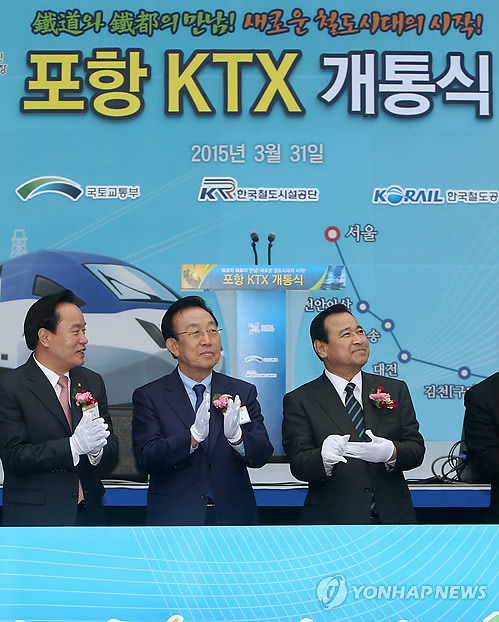 | △ 포항 KTX시대 개막 (포항=연합뉴스) 김준범 기자 = 31일 오후 경북 포항 신포항역사에서 열린 포항 KTX개통식에서 이완구 국무총리(가운데), 김관용 경북지사(오른쪽), 이병석 의원(왼쪽)이 박수치고 있다. |