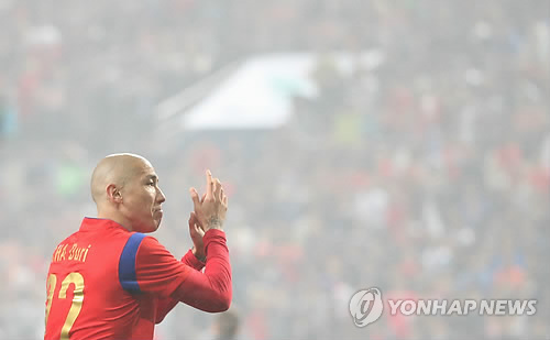 그는 주장 완장을 기성용(스완지시티)에게 채워주고 포옹한 뒤 그라운드를 나섰다. 관중은 기립박수를 쳤다.