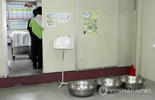 | △ 빗물 새는 급식소 (청주=연합뉴스) 윤우용 기자 = 비가 내린 31일 조립식 건물인 충북예술고 급식소에 빗물이 새자 학교관계자들이 대야를 가져다 놓고 빗물을 받고 있다. 2015.3.31 ywy@yna.co.kr |