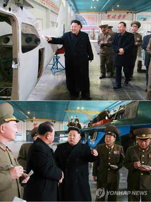 | △ '자체 생산' 비행기에 만족한 북한 김정은 (서울=연합뉴스) 북한 노동당 기관지 노동신문은 1일 김 제1위원장이 군수기계공장을 방문해 새로 제작한 경비행기의 시험 비행을 참관한 데 이어 직접 경비행기에 올라 이·착륙 시험 비행을 진행했다고 밝혔다. 이 공장은 군용비행기와 각종 관련 제품을 생산하는 군수기계공장으로 작년 8월 김 제1위원장이 방문해 소비자에게 호평받는 제품 생산을 주문한 바 있다. 김 제1위원장은 "(경비행기가) 조종하기 편리하고 발동기 소리가 아주 좋다"며 "공장·기업소 일꾼들, 과학자, 기술자, 노동계급이 창조적 지혜와 열정을 다 바쳐 모든 장비·장치들이 국산화된 경비행기를 훌륭히 만들어냈다"고 치켜세웠다. 2015.4.1 nkphoto@yna.co.kr |