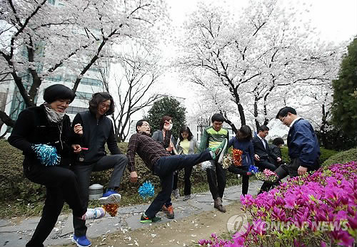 | △ 제기차기 어려워 (울산=연합뉴스) 이상현 기자 = 울산시가 건강을 다지는 민속놀이인 제기차기 보급 운동을 선언한 가운데 1일 복지여성국 직원들이 벚꽃이 만개한 시청 정원에서 제기차기를 하고 있다. 2015.4.1 leeyoo@yna.co.kr |