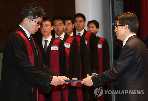 | △ 임명장 받는 신임 검사들 (과천=연합뉴스) 양지웅 기자 = 1일 경기도 과천시 정부과천청사에서 열린 '신임 검사 임관식'에서 신임 검사들이 황교안 법무부 장관에게 임명장을 받고 있다. 2015.4.1 yangdoo@yna.co.kr |