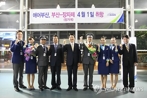 | △ 에어부산 부산∼장자제 취항 (부산=연합뉴스) 에어부산이 1일 부산∼장자제 노선을 신규 취항하고 기념식을 하고 있다. 2015.4.2 joseph@yna.co.kr |