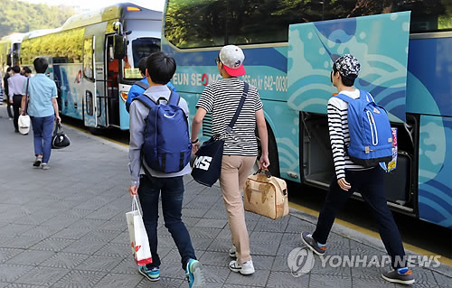| △ 세월호 참사가 발생한 지 1년이 지났지만 올해 전국 초·중·고교의 수학여행은 여전히 주춤한 것으로 나타났다. 수학여행을 떠나기 위해 관광버스로 이동하고 있는 고등학생들. (연합뉴스 자료사진) |