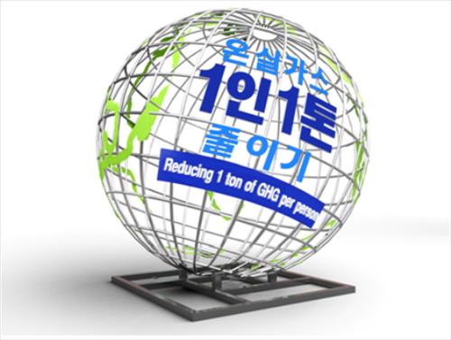 조형물 양면에 한글로 '온실가스 1인 1톤 줄이기'와 영문으로 'Reducing 1ton of GHC(Green House Gas) per person' 문구를 표기했다.