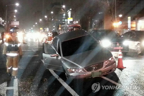 경찰과 소방 당국에 따르면 이날 오후 9시 49분께 삼성중앙역 2번 출구 앞 편도 4차선 도로에서 0.6m 깊이의 구멍이 나 이모(55·여)씨가 몰던 그랜저 승용차의 조수석 앞바퀴가 빠졌다.
