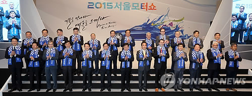 | △ 윤상직 산업통상자원부 장관(앞줄 가운데) 등 참석 내빈들이 3일 경기도 고양시 킨텍스에서 열린 2015 서울 모터쇼 개막식에서 기념촬영하고 있다. |