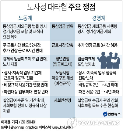 | △ <그래픽> 노사정 대타협 주요 쟁점 (서울=연합뉴스) 이재윤 기자 = 노·사·정이 노동시장 구조개편을 위한 사회적 대타협을 위해 31일 마지막 마라톤협상을 벌였지만 결국 최종 합의에 이르지 못한 채 진통을 겼었다. yoon2@yna.co.kr |