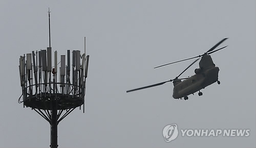 | △ 저공비행하는 CH-47 치누크 헬기 (포천=연합뉴스) 임병식 기자 = 3일 오후 경기도 포천시 미8군 로드리게스 훈련장(영평사격장) 입구에서 영평·승진사격장 대책위 회원들과 인근 마을 주민들이 안전 대책을 요구하는 집회를 시작했다. 지난해 11월 이후 사격장 너머 마을인 영북면에서만 총탄과 포탄이 떨어지는 사고가 세 차례 났으며, 인근 주민들은 수년 동안 소음에 시달렸다. 로드리게스 훈련장은 영중면 일대 약 1천322만㎡ 규모로 아시아에서 가장 큰 미군 실사격 훈련장이다. 사진은 훈련장 밖 민간 지역 상공에서 CH-47 치누크 헬기가 저공비행하는 모습. 2015.4.3 andphotodo@yna.co.kr |