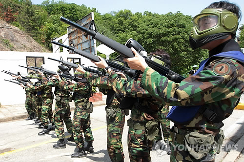 | △ 2012년 5월 경기도 고양시 덕양구 지축동 수도방위사령부 56사단 지축예비군 훈련장에서 서강대학교 대학생 예비군들이 시가지 전투훈련을 받고 있다. (연합뉴스 자료사진) |