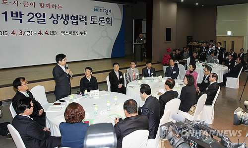 | △ 경기도 지자체장 한자리에 (안산=연합뉴스) 3일 오후 경기도 안산시 대부도 엑스퍼트연수원 컨벤션홀에서 남경필 지사와 시장, 군수, 부시장 등이 함께하는 1박2일 상생협력 토론회가 열리고 있다. 토론회는 올해 연정(聯政)의 기치로 내건 '시·군과의 예산연정'을 위해 지난 1월 시장·군수 간담회에서 남 지사가 제안해 성사됐다. 2015.4.3 <<경기도 제공>> zorba@yna.co.kr |