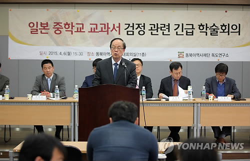 | △ 일본 중학교 교과서 검정 관련 긴급 학술회의 (서울=연합뉴스) 이정훈 기자 = 김학준 동북아역사재단 이사장이 6일 오후 서울 서대문구 미근동 재단 대회의실에서 열린 일본 중학교 교과서 검정결과 발표 관련 긴급 학술회의에서 개회사를 하고 있다. 2015.4.6 uwg806@yna.co.kr |