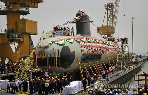 | △ 6일 인도 뭄바이 마자곤독에서 열린 스코르펜 공격잠수함 1번함 진수식(AP=연합뉴스) |