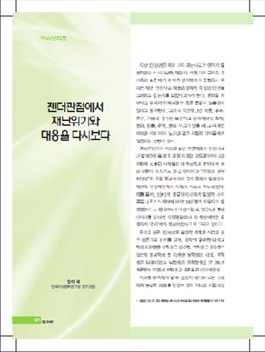 이처럼 재난은 모든 사람에게 같은 피해를 주는 것이 아니라 사회적으로 취약한 집단에 더 큰 피해를 주며 특히 여성은 재난에 취약한 반면 위기대처능력은 떨어진다고 장 연구위원은 지적했다.