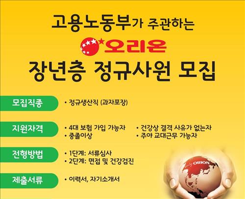 오리온은 먼저 상반기 중에 고용노동부와 함께 매주 구인 행사를 열고 전북 익산공장에서 근무할 55∼59세 남녀직원 16명을 모집하기로 했다.
