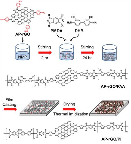이어 아민기가 붙어 있는 기능화된 그래핀을 엔지니어링 플라스틱의 하나인 폴리이미드 원료 물질과 용액상태에서 중합반응시켜 고분자와 그래핀 간 결합을 유도, 폴리이미드 수지 내에 그래핀이 균일하게 분산된 고분자 복합소재를 만들었다.