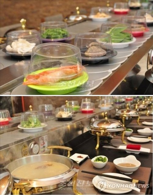 (서울=연합뉴스) 임은진 기자 = 회전판을 타고 돌아가는 고기나 해산물, 채소 를 전골 국물에 데쳐 양념에 찍어먹는 회전식 전골집이 북한에서 인기를 끌고 있다.