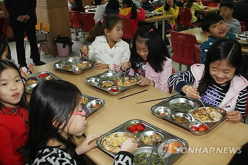 | △ 급식이 즐거운 아이들 (창원=연합뉴스) 김선경 기자 = 1일 오후 경남 창원시 의창구 동읍 신방초등학교 급식소에서 학생들이 웃으며 점심 식사를 하고 있다. 경남에서는 도의 무상급식 지원 중단으로 1일부터 도내 각급 학교 무상급식이 유상급식으로 전환됐지만, 급식비는 매월 중순 징수를 하기 때문에 이달 초순까지는 대부분 학생이 종전대로 급식할 것으로 예상된다. 2015.4.1 ksk@yna.co.kr |