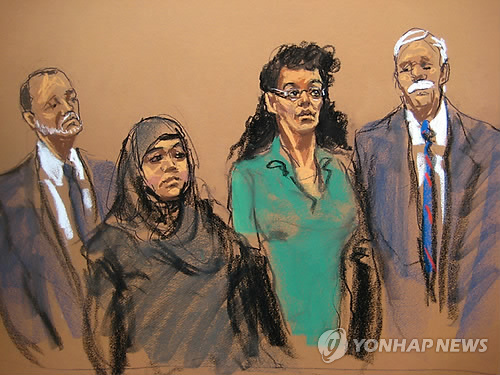 | △ In this courtroom sketch, defendants Noelle Velentzas, center left and Asia Siddiqui, center right, appear in federal court with their attorneys, Thursday, April 2, 2015, in New York. The two women were arrested Thursday on charges they plotted to wage violent jihad by building a homemade bomb and using it for a Boston Marathon-type terror attack. (AP Photo/Jane Rosenberg) |