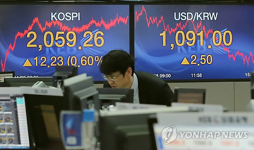| △ 환율 1,090원대 회복 (서울=연합뉴스) 이정훈 기자 = 8일 서울 외환시장에서 원·달러 환율 종가는 달러당 1,091.0원으로, 전일 종가보다 2.5원 올랐다. 이날 서울 중구 명동 외환은행 본점 딜링룸. |