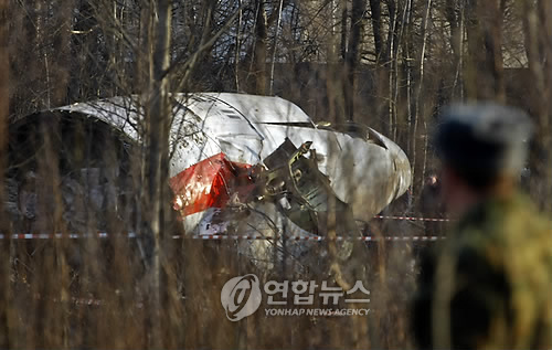 | △ 산산조각난 비행기 잔해 10일 비행기 추락 사고가 일어난 러시아 스몰렌스크 공항 인근에서 러시아 경찰들이 비행기 잔해를 둘러보고 있다. 이날 사고로 비행기에 탄 레흐 카친스키 폴란드 대통령 등 폴란드 정부 고위 관리들이 대거 숨졌다. (AP=연합뉴스) Russian police officers walk near some of the wreckage at the plane crash site near Smolensk, western Russia, Saturday, April 10, 2010. Polish President Lech Kaczynski, his wife and some of the country's most prominent military and civilian leaders died Saturday April 10, 2010 along with dozens of others when the presidential plane crashed as it came in for a landing in thick fog near Smolensk in western Russia. (AP Photo/Mikhail Metzel) |