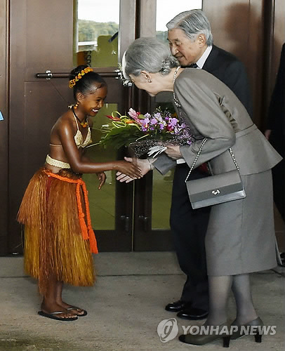 | △ 팔라우 소녀에게 환영받는 일왕 내외(AP.연합뉴스.자료사진 |