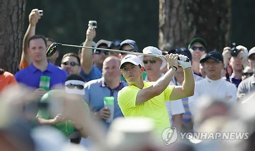 | △ 미국프로골프(PGA) 세계랭킹 1위인 로리 매킬로이(가운데, 북아일랜드)가 7일(현지시간) 미국 조지아주 오거스타 내셔널 골프장에서 제79회 PGA 투어 마스터스 토너먼트를 이틀 앞두고 열린 연습 경기 2라운드 17번홀에서 티샷을 날리고 있다.(EPA=연합뉴스) |