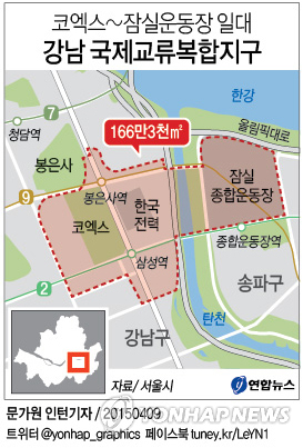 (서울=연합뉴스) 황희경 기자 = 현대차그룹이 사들인 한국전력 부지가 포함된 국제교류복합지구 지구단위계획구역에 잠실종합운동장과 탄천 일대가 포함됐다.