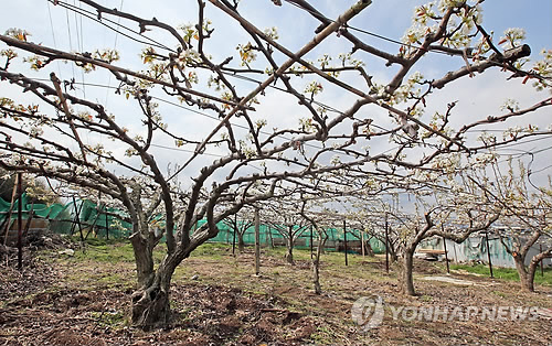 | △ 울산지역 배 과수원 면적·수확량 감소 (울산=연합뉴스) 김용태 기자 = 울산지역 배 과수원 면적이 지난해 기준 996㏊로 10년 전인 2005년에 비해 33% 감소한 것으로 나타났다. 배 수확량도 2만3천526t으로 2005년보다 24.5% 줄었다. 사진은 9일 오전 울산시 북구의 한 배 과수원의 모습. 2015.4.9 yongtae@yna.co.kr |