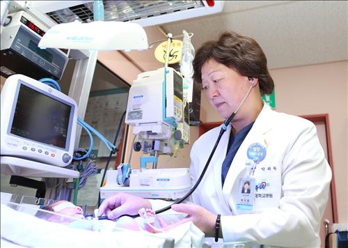 | △ 중앙대학교병원 소아외과 박귀원 교수가 황달 증세를 보이는 신생아를 진료하고 있다.<중앙대학교의료원 제공> |
