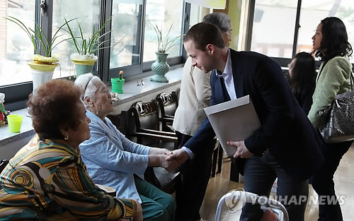 | △ 나눔의집 방문한 미국 상·하 의원 보좌관 (경기광주=연합뉴스) 9일 경기도 광주시 퇴촌면 일본군 위안부 피해 할머니의 보금자리 나눔의 집을 방문한 미국 상·하 의원 보좌관들이 위안부 피해 할머니들과 만나 인사를 나누고 있다. (나눔의 집 제공) |