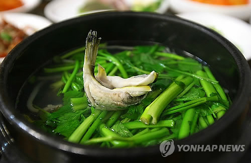 졸복 위로 덮인 미나리가 깔끔한 느낌을 더한다.