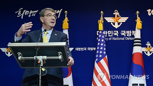 | △ 사드 답변하는 카터 미 국방장관 (서울=연합뉴스) 홍해인 기자 = 애쉬턴 카터 미 국방장관이 10일 오후 서울 용산구 국방부에서 한미 국방장관 회담 후 가진 기자회견에서 미국의 고고도미사일방어체계 '사드(THAAD)'와 관련해 취재진의 질문에 답하고 있다. |