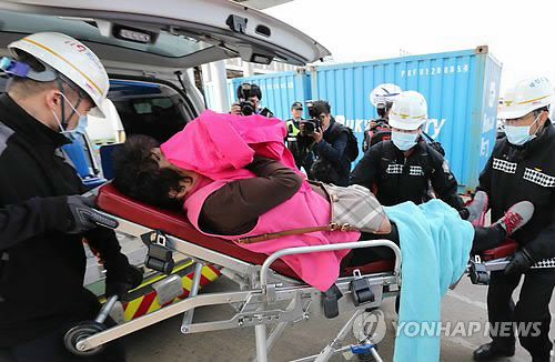 | △ 국제여객선 환자 후송 (부산=연합뉴스) 조정호 기자 = 10일 부산을 출발 일본 후쿠오카로 향하던 국제여객선 코비 3호가 태종대 앞바다에서 돌고래로 추정되는 물체와 부딪치는 사고가 발생했다. 119구조대가 여객선 환자를 후송하고 있다. |