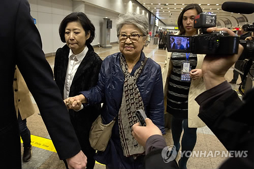 | △ 산드라 서(가운데 안경쓴 이)씨가 9일(현지시간) 중국 베이징 서우두 국제공항에 도착, 지인과 손잡고 밖으로 걸어나가고 있다. |