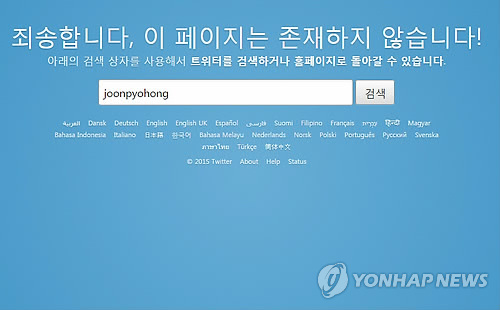 한편 자신의 영문 이름인 'JoonPyoHong'라는 아이디를 사용하는 홍 지사 트위터에는 '죄송합니다. 이 페이지는 존재하지 않습니다'라는 메시지만 나온다.