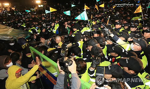 문화제를 마친 참가자들은 오후 7시께 플래카드를 들고 구호를 외치며 청와대를 향해 행진하다 경찰과 충돌이 빚어졌다.