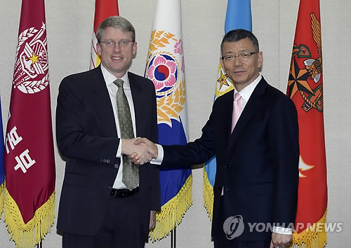| △ 한·미 통합국방협의체 회의 (서울 사진공동취재단=연합뉴스) 17일 서울 용산구 국방부에서 열린 제6차 한·미 통합국방협의체(KIDD)회의에서 한국측 대표 류제승 국방정책실장(오른쪽)과 미국측 대표 데이비드 헬비 동아시아부차관보가 악수하고 있다. 2014.9.17 photo@yna.co.kr |