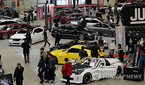 | △ 튜닝카 살펴보는 관람객 (일산=연합뉴스) 최재구 기자 = 21일 일산 킨텍스에서 열린 튜닝카 경진대회에서 관람객들이 다양한 목적으로 튜닝된 차량을 살펴보고 있다. 2014.11.21 jjaeck9@yna.co.kr |