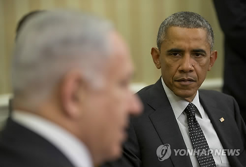 | △ (AP=연합뉴스) 지난해 10월1일 백악관에서 있었던 미-이스라엘 정상회담에서 네타냐후 총리를 바라보고 있는 오바마 대통령. |