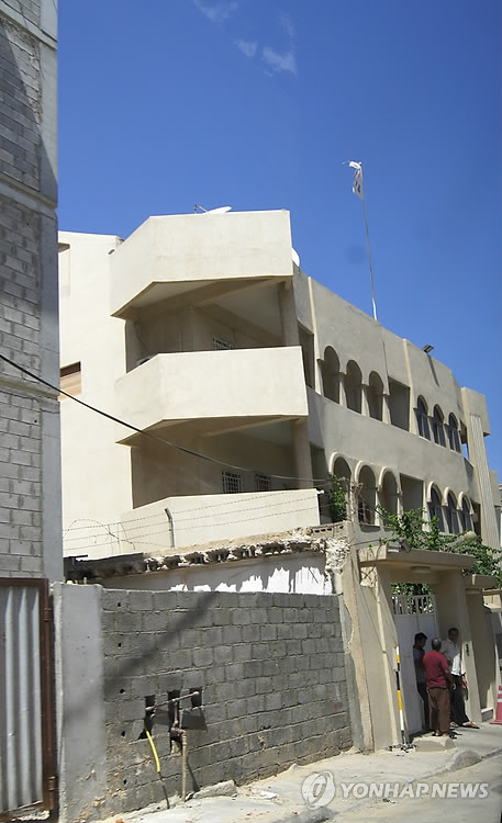 | △ 트리폴리 韓대사관에 IS 공격…경비원 2명 사망 (서울=연합뉴스) 리비아 수도 트리폴리에 있는 한국 대사관이 12일(현지시간) 무장괴한의 공격을 받아 경비원 2명이 숨지고 1명이 부상했다고 신화통신이 보도했다. 통신은 보안 당국 관계자를 인용해 차를 타고 지나가던 무장 단체가 대사관 앞에서 다수의 총알을 발사했다고 전했다. 이 관계자는 "이번 사건은 이슬람 국가(IS)에 의해 자행된 것"이라고 전했다. 사진은 2011년 8월 28일 소총 무장 괴한 10여 명 난입 사건 당시의 리비아 주재 한국 대사관 모습. photo@yna.co.kr |