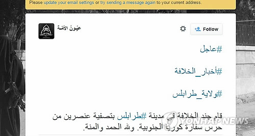 | △ IS연계 무장조직 주리비아 한국대사관 공격 주장 (두바이=연합뉴스) 강훈상 특파원 = 수니파 무장조직 '이슬람국가'(IS)를 추종하는 트위터 계정을 통해 12일 오전 10시께(한국시간) 리비아 트리폴리 주재 한국대사관 공격을 주장하는 글이 게시됐다. 이 글은 '긴급, 칼리파(IS)의 트리폴리 병사들이 한국대사관 경비 2명을 사살했다. 알라를 찬양한다'는 내용이다. hskang@yna.co.kr |