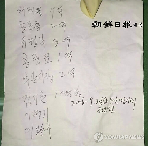 | △ 성완종 전 회장 메모 (서울=연합뉴스) 성완종 전 경남기업 회장의 시신 상의에서 발견된 메모가 지난 11일 언론을 통해 공개됐다. 이 메모에는 '허태열 7억, 홍문종 2억, 유정복 3억, 홍준표 1억, 부산시장 2억, 김기춘 10만불, 이병기, 이완구'란 글자와 '김기춘 10만불'이란 글자 옆에 '2006.9.26日 독일 벨기에 조선일보'라는 문구가 적혀 있다. (조선일보 제공) |