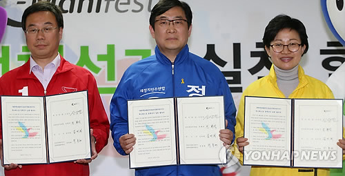 이들은 공명선거와 정책선거를 약속하고 선관위가 제시한 매니페스토 협약서에 서명했다.
