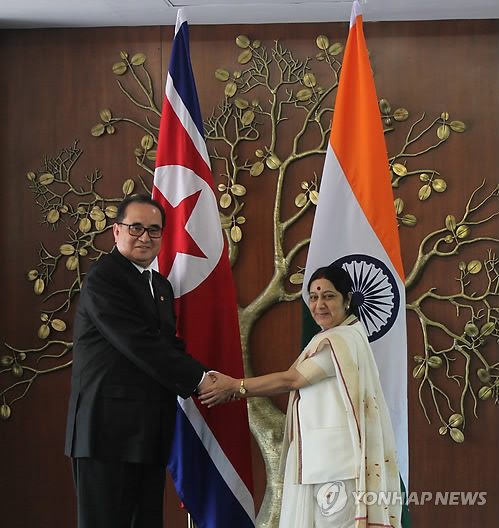 | △ 악수하는 북한-인도 외교 장관 (뉴델리=연합뉴스) 나확진 특파원 = 13일 인도 뉴델리 외교부 청사에서 수슈마 스와라지 인도 외교장관(오른쪽)이 자국을 방문한 리수용 북한 외무상과 회의에 앞서 악수를 하고 있다. 2015.4.13 rao@yna.co.kr |