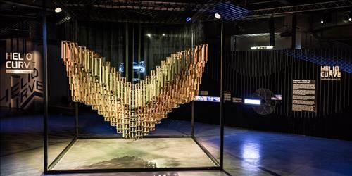 '헬리오 커브'는 높이 5m, 길이 26m의 전시공간 전체를 아우르는 대형 예술품이다. 수작업으로 만들어진 400개의 나무블록이 선으로 연결돼 양쪽 구동축의 움직임을 통해 3미터 높이의 파도가 치는 듯한 거대한 자연의 움직임을 그려냈다.